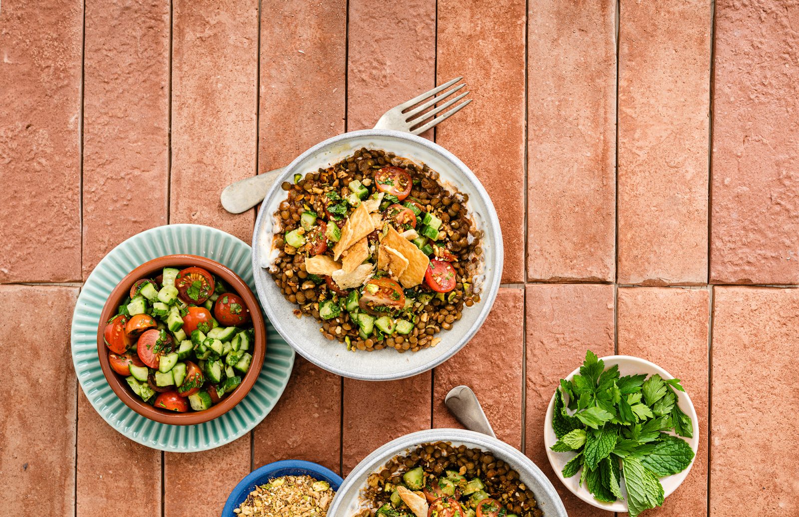 5. To serve, smear 2 Tbsp (30 mL) garlic yogurt across the bottom of each shallow bowl. Add ¾ cup (175 mL) warm lentils, a scoop of fresh tomato-cucumber salad, and finish with a sprinkle of dukkah, pita crisps, and an optional drizzle of oil.