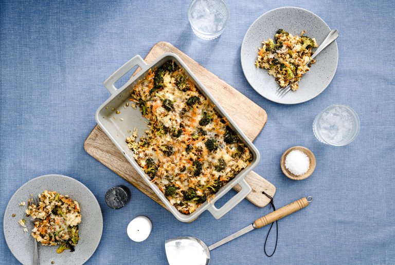Bacon-Topped Cheesy Cauliflower & Lentil Bake