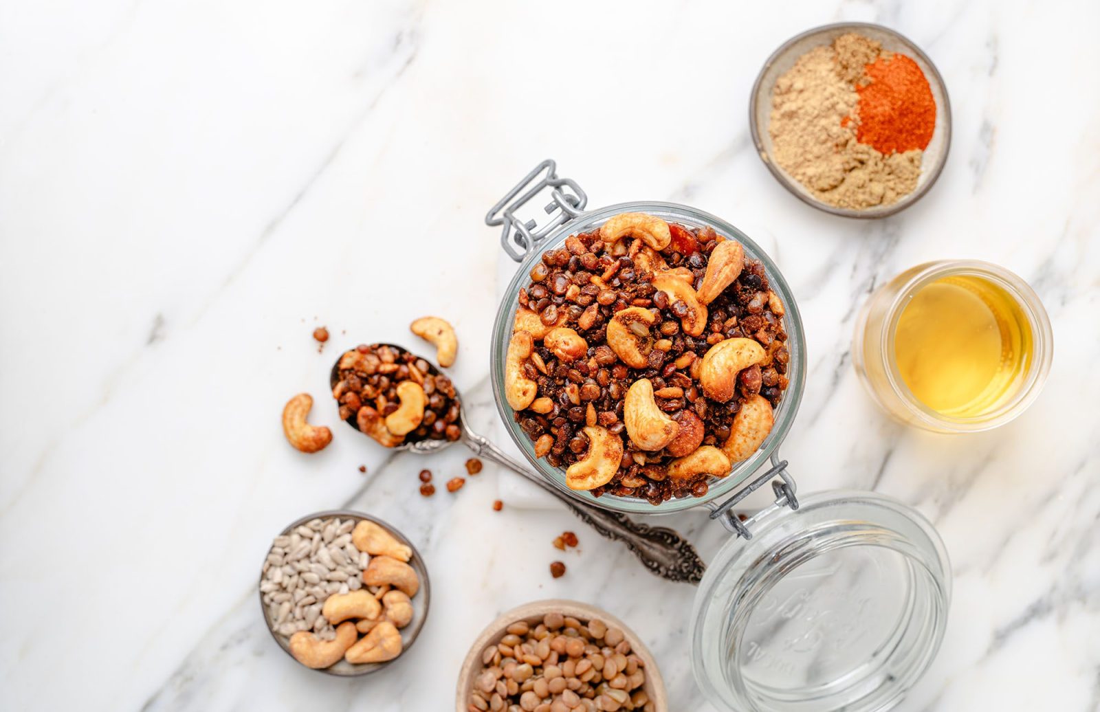 Lentils, seeds, and nuts are roasted with agave, paprika, coriander, cumin, and ginger for a savory granola.