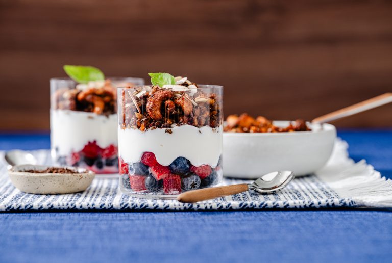 For each cup, add ¼ cup (60 mL) diced pineapple, ½ cup (125 mL) yogurt mixture, ½ cup (125 mL) lentil granola, and garnish with 1 Tbsp (15 mL) coconut, 1 Tbsp (15 mL) almonds, and optional mint leaf and drizzle of honey.